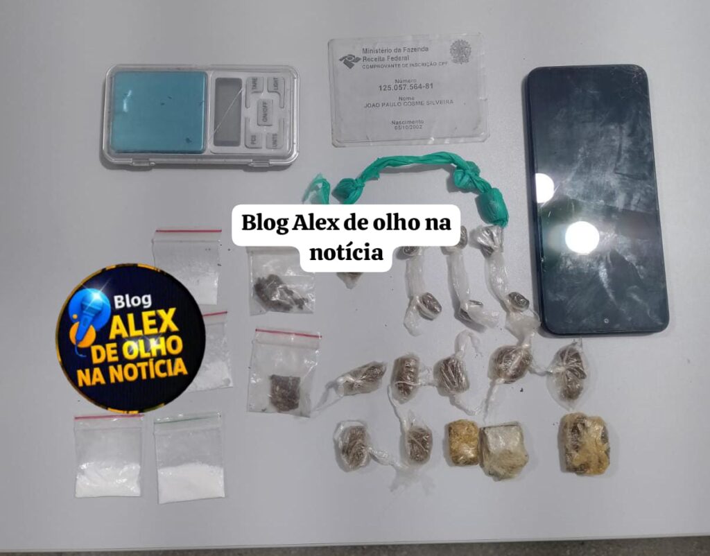 De imediato, a equipe se deslocou até o endereço indicado, localizado na Rua Assú, nas proximidades da Cidade Histórica. No local, após buscas, foram encontrados 30 gramas de maconha (23 trouxinhas), 2,5 gramas de cocaína (5 papelotes), um celular e uma balança de precisão.