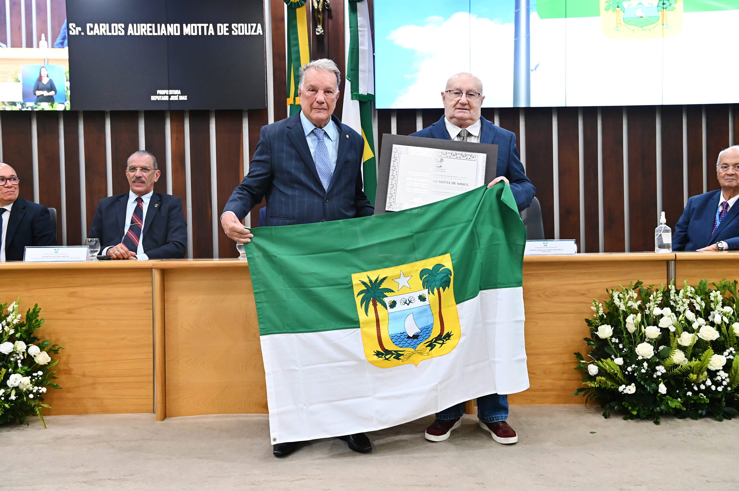 A Assembleia Legislativa do Rio Grande do Norte fez a entrega, nesta sexta-feira (24), do Título de Cidadão Norte-Rio-Grandense ao senhor Carlos Aureliano Motta de Souza, em reconhecimento à sua trajetória profissional e às relevantes contribuições prestadas ao desenvolvimento do Estado. A proposição da homenagem é de autoria do deputado José Dias (PL), que destacou a relevância do homenageado nas suas áreas de atuação.