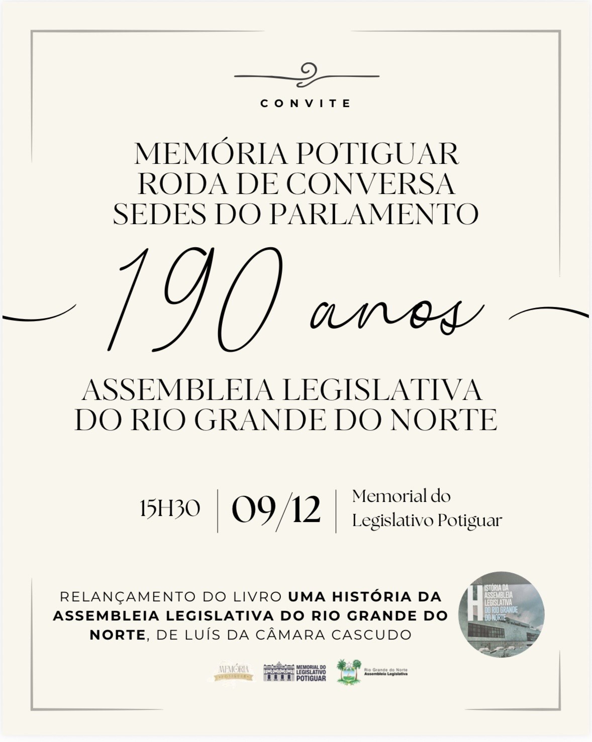 Na ocasião, o Legislativo também fará o relançamento do livro “Uma história da Assembleia Legislativa do RN”, de Luís da Câmara Cascudo, que, além de historiador, escritor, antropólogo e folclorista, também foi deputado estadual.