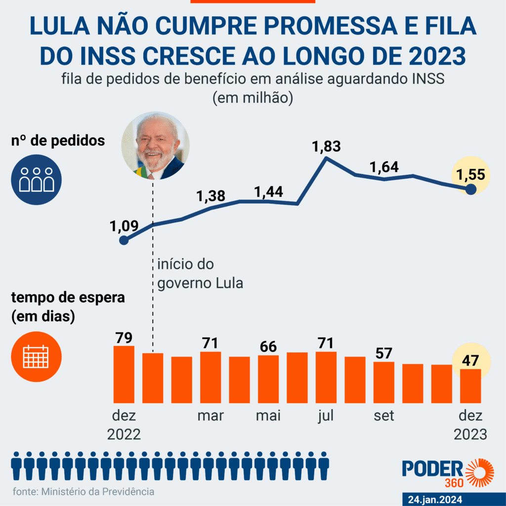 O presidente Luiz Inácio Lula da Silva (PT) não cumpriu a promessa de zerar a fila de espera do INSS (Instituto Nacional da Seguridade Social). A meta foi estabelecida em seu discurso de posse, em 1º de janeiro de 2023.