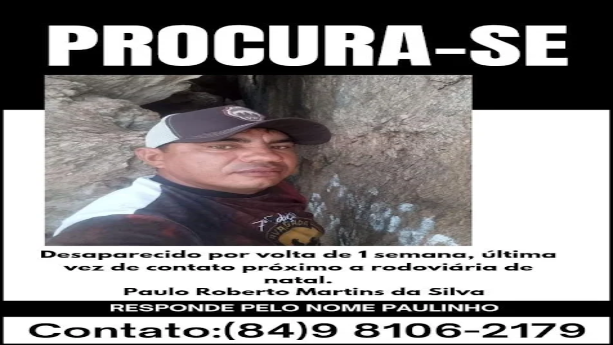 Familiares e amigos buscam informações sobre o paradeiro de Paulo Roberto Martins da Silva, da cidade de Afonso Bezerra, conhecido como Paulinho, que está desaparecido há aproximadamente uma semana. De acordo com a família, o último contato registrado com ele ocorreu nas proximidades da rodoviária de Natal, no Rio Grande do Norte.