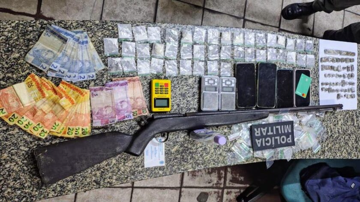 De imediato, a equipe se deslocou até o endereço indicado. Ao perceberem a chegada da viatura, alguns indivíduos tentaram fugir do local. Um dos suspeitos foi alcançado e detido pelos policiais. Durante a abordagem, os militares encontraram e apreenderam diversos materiais ilícitos, incluindo:
