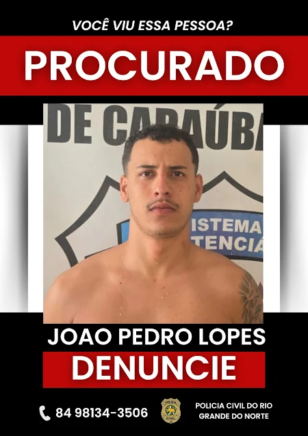 A Polícia Civil do Rio Grande do Norte divulgou a imagem de um homem identificado como João Pedro Lopes, considerado procurado pelas autoridades.