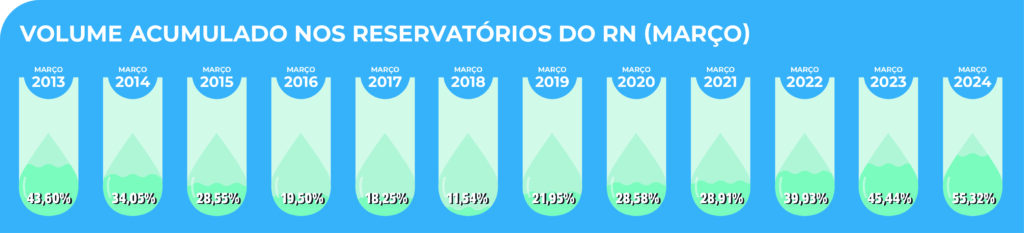 Em março de 2019, os reservatórios alcançaram 21,95% (10 pontos a mais); em 2020, mais 7 pontos percentuais; e em 2022, mais 11. Em 2023, no mês de março, o Rio Grande do Norte alcançou os 45,44% de volume acumulado. E agora, de um ano para o outro, conseguiu avançar mais 10 pontos percentuais, atingindo os 55,32%.