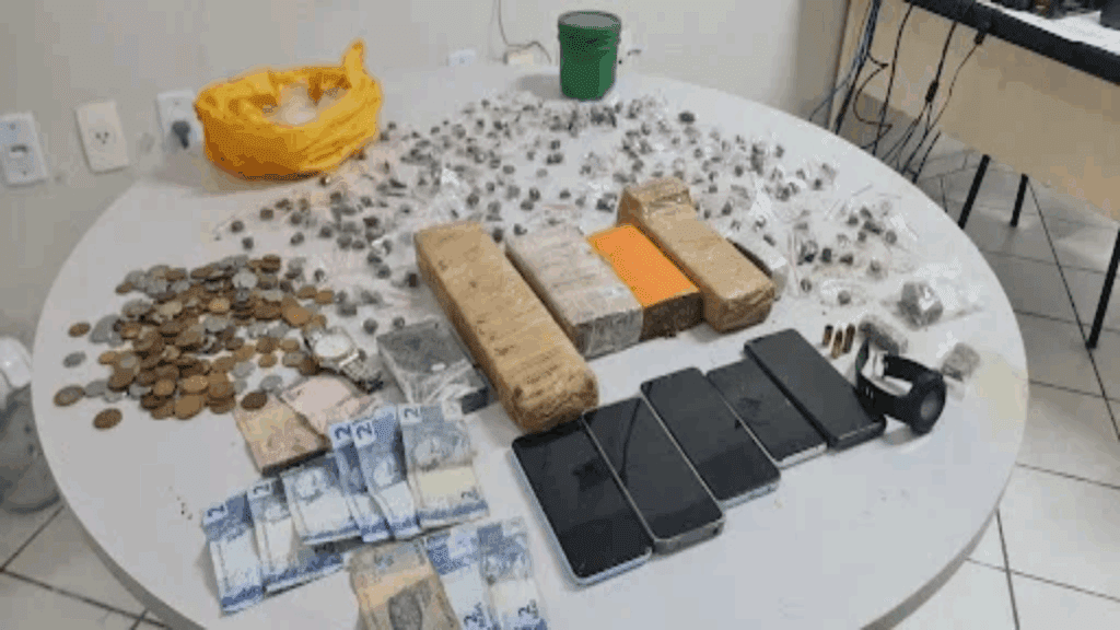 Além da droga do tipo maconha, também foram apreendidos, cinco celulares, três munições, sendo uma de calibre 9mm, outra de .40 e uma deflagrada de 380.