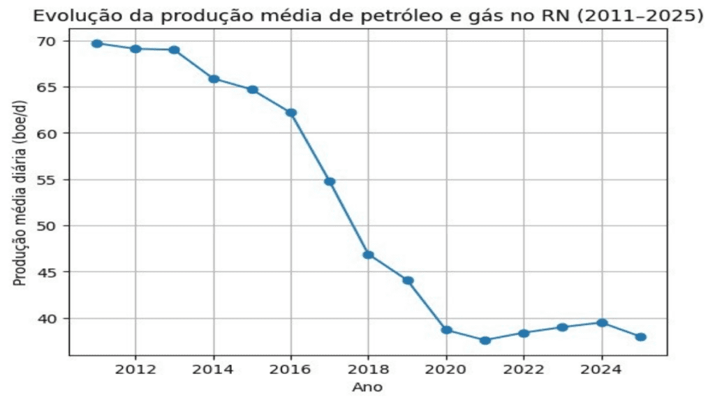 A trajetória recente da produção de petróleo e gás no estado revela um processo contínuo de declínio, que se intensifica a partir da segunda metade da década passada, acompanhando mudanças estruturais na política nacional de exploração e produção. Dados da série histórica entre 2011 e 2025 indicam que o Rio Grande do Norte saiu de um patamar médio de cerca de 70 mil barris diários para níveis próximos de 38 mil barris por dia, consolidando uma perda expressiva de capacidade produtiva ao longo do período.