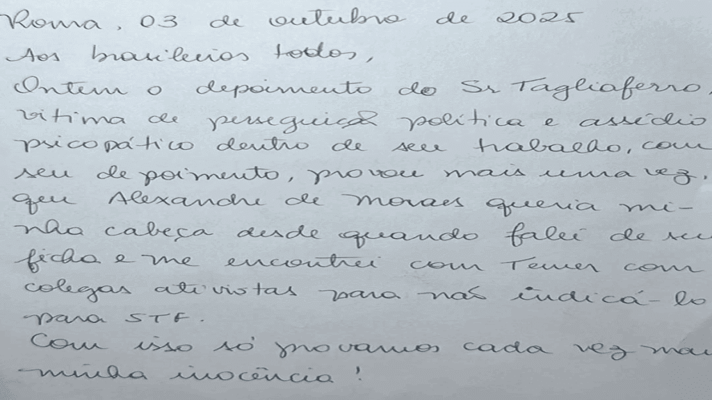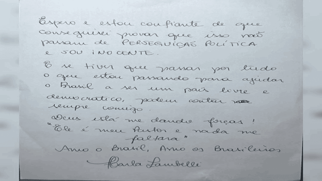 Obtida pela coluna Paulo Cappelli, a carta de Zambelli foi redigida na quarta-feira (3/9). A deputada foi condenada pelo STF a 10 anos de prisão e à perda do mandato invasão ao sistema do Conselho Nacional de Justiça (CNJ).